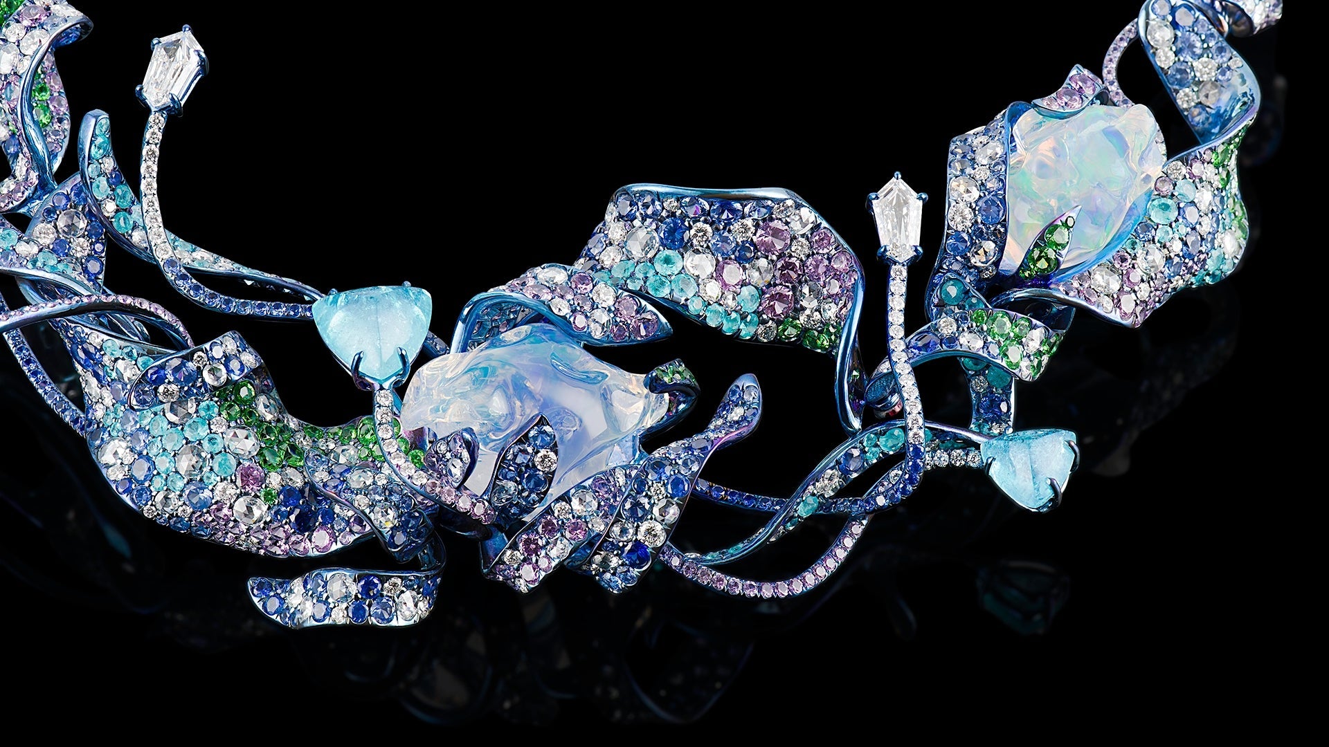 The final adornment of Vaneesha was the setting of the gems. A detailed process this stage of setting gems took more than 4 months. Following Dani’s color maps, skilled craftsmen set 460 diamonds, 444 blue sapphires, 305 purple sapphires, 79 tsavorites, and 130 Paraiba tourmalines. Done under magnification so that every detail is perfect, Neha closely supervised each setting. The crowning glory of Vaneesha were the centre gems - three Mexican Water Opals weighing 45.63 carats, three Paraiba Tourmaline cabochons and five step cut diamonds. In their final placements, the gems elevated the necklace to an intense work of art. The entire design and fabrication process of Vaneesha spanned a full year.